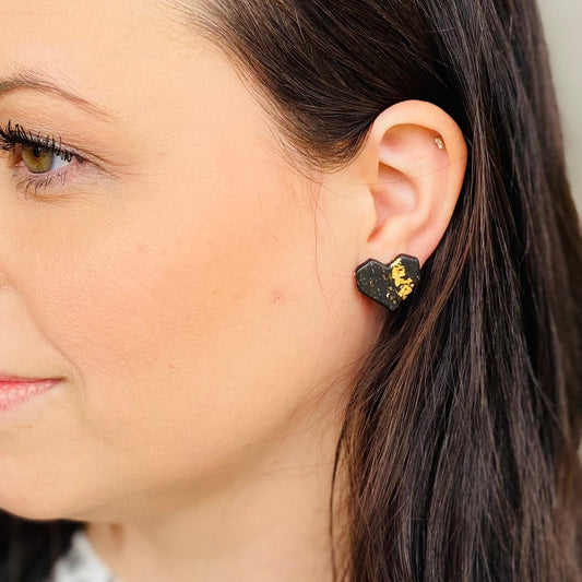 Black Clay and Gold Flake Geometric Heart Stud Earrings